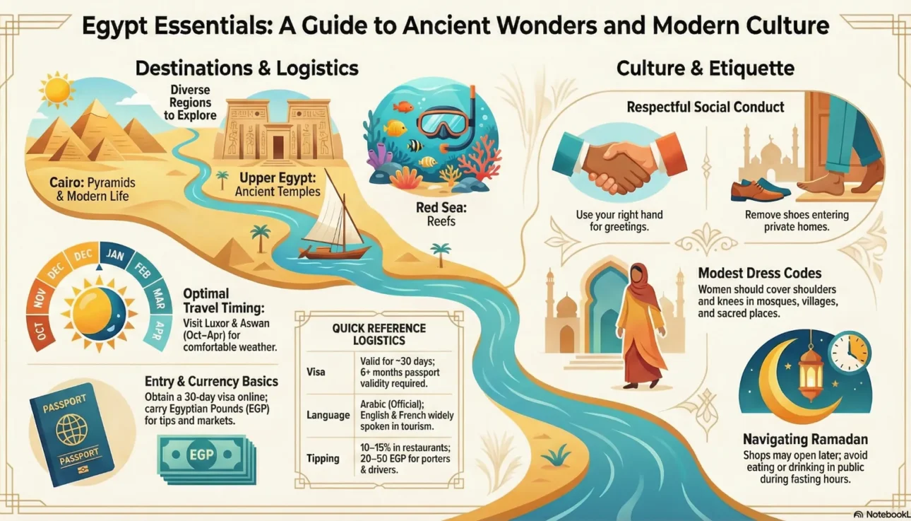 - Upper Egypt (Luxor/Aswan): Hot and sunny; best Oct–Apr.
